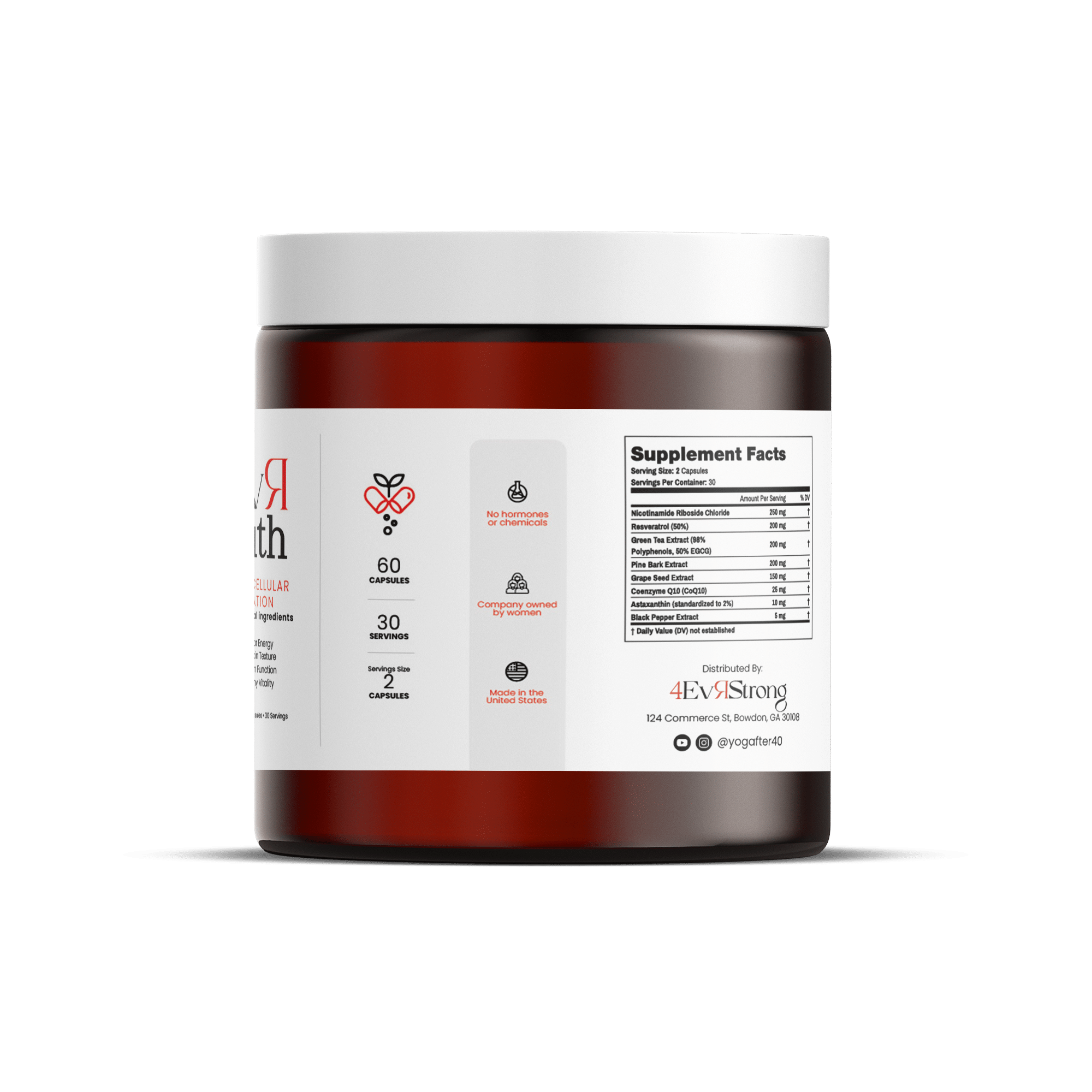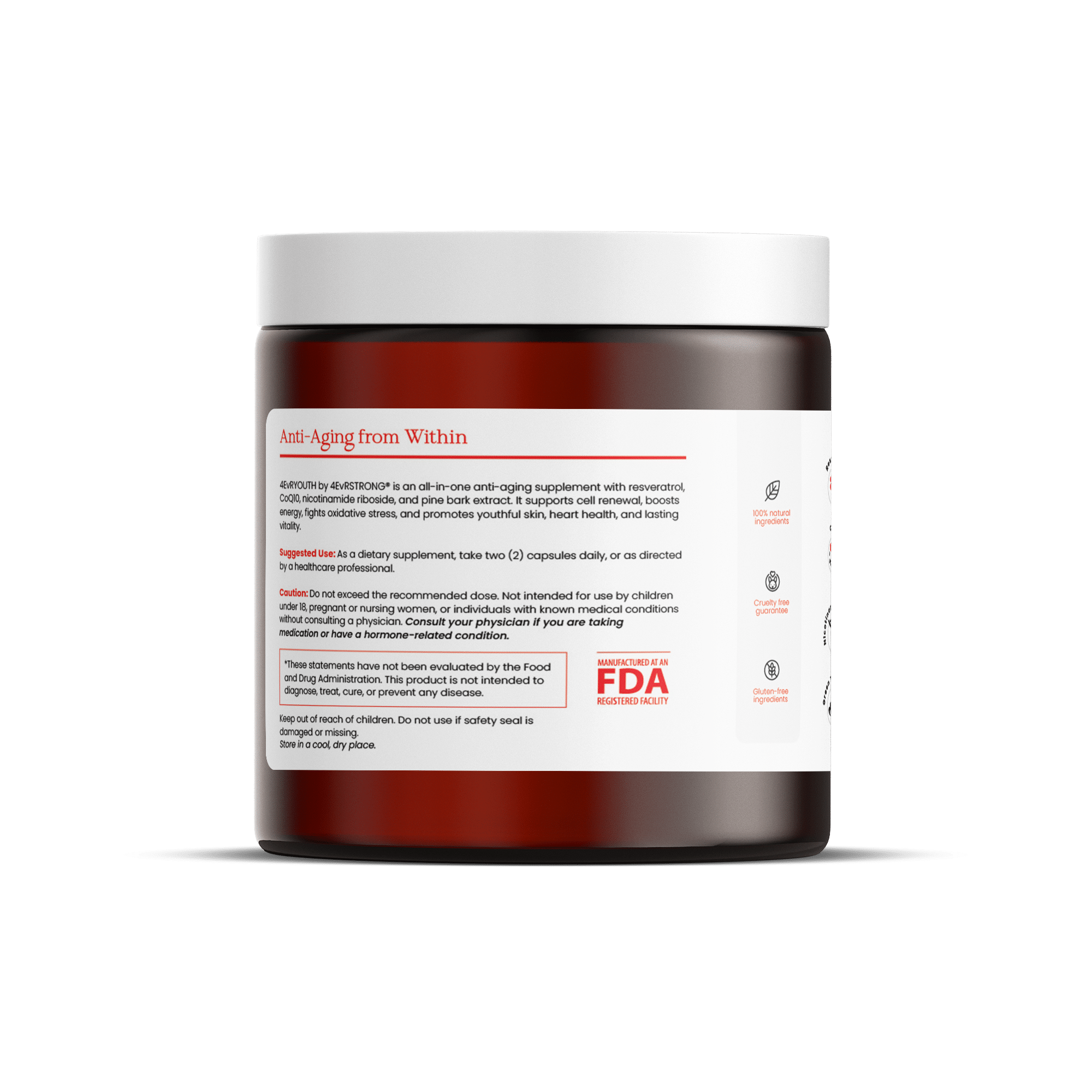 4EvRYOUTH is a powerful, antioxidant-packed daily supplement designed to support youthful vitality from the inside out. Formulated with Resveratrol, Green Tea Extract, Pine Bark, and Astaxanthin, this advanced blend helps fight oxidative stress and supports cellular rejuvenation. With key ingredients like Nicotinamide Riboside and CoQ10, 4EvRYOUTH boosts energy, promotes longevity, and helps protect your body at the cellular level. Grape Seed and Black Pepper Extracts enhance absorption and amplify the formula’s antioxidant effects. Whether you’re looking to maintain youthful, radiant skin, boost brain function, support heart health, or simply feel more energized, 4EvRYOUTH works to revitalize every part of you—helping you look, feel, and live your best at every stage of life. Because timeless vitality isn’t a dream—it’s 4EvR.